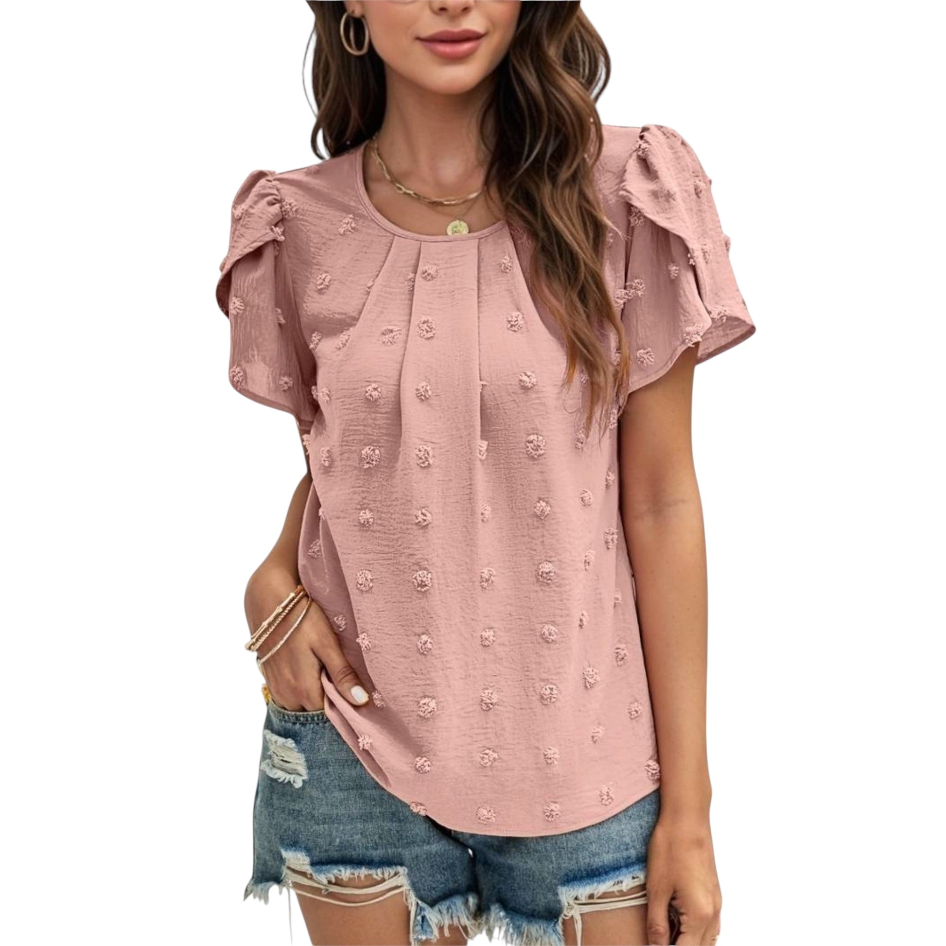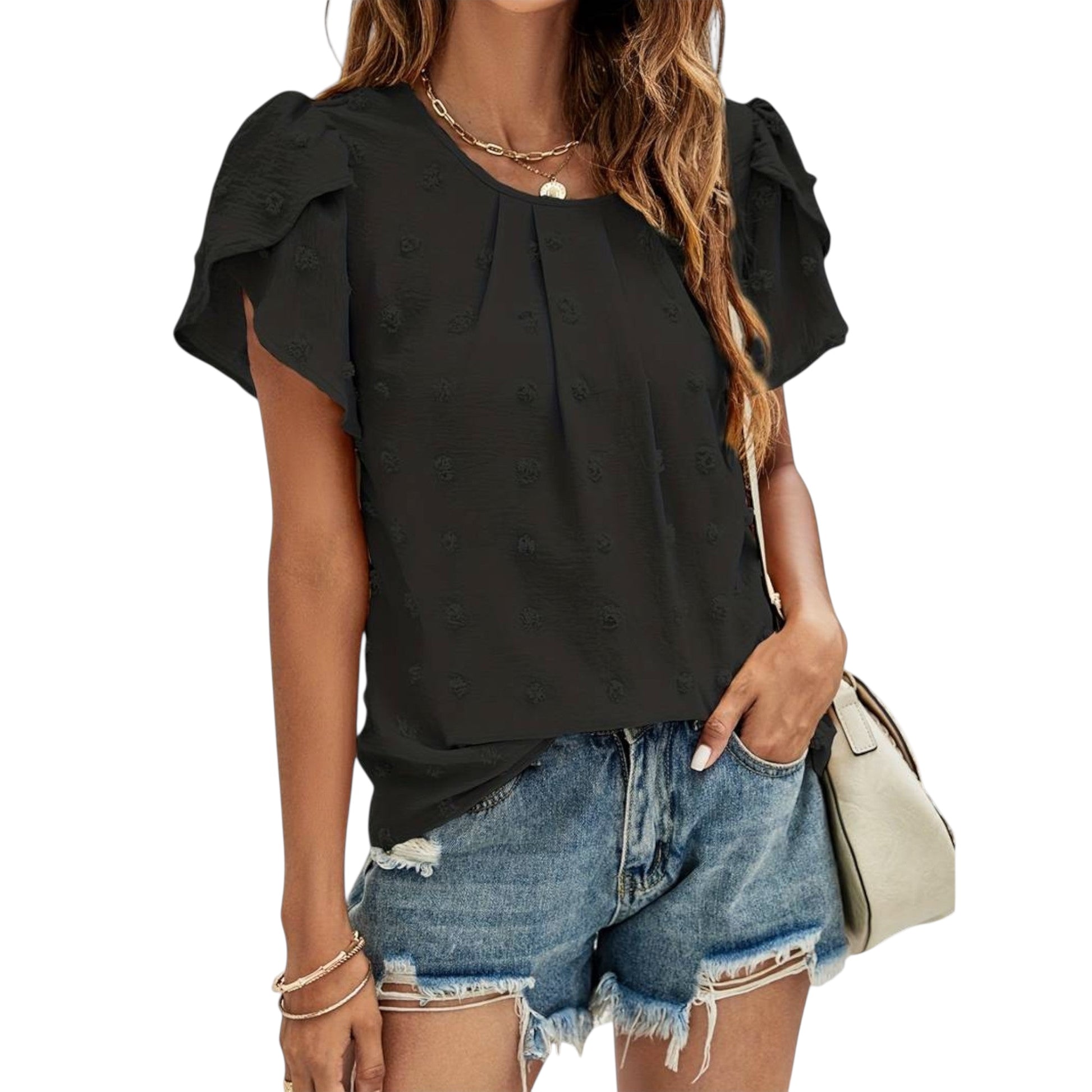 Elirelle verbindet romantische Details mit zeitloser Eleganz. Die feine Swiss-Dot-Struktur und die verspielten Blumenärmel verleihen der Bluse eine feminine Ausstrahlung, die sowohl im Alltag als auch zu besonderen Anlässen überzeugt.