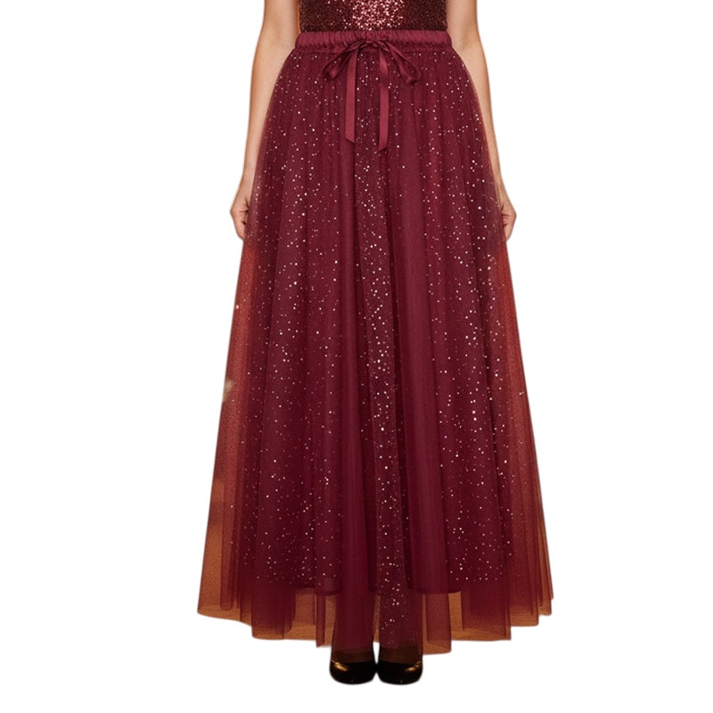 Der weit geschnittene Rock mit A-Linien-Silhouette verleiht dem Design eine elegante Bewegung, während dezente Glanzakzente für eine festliche Ausstrahlung sorgen. Der Kordelzug in der Taille unterstreicht die flexible Passform und ergänzt das Design funktional.