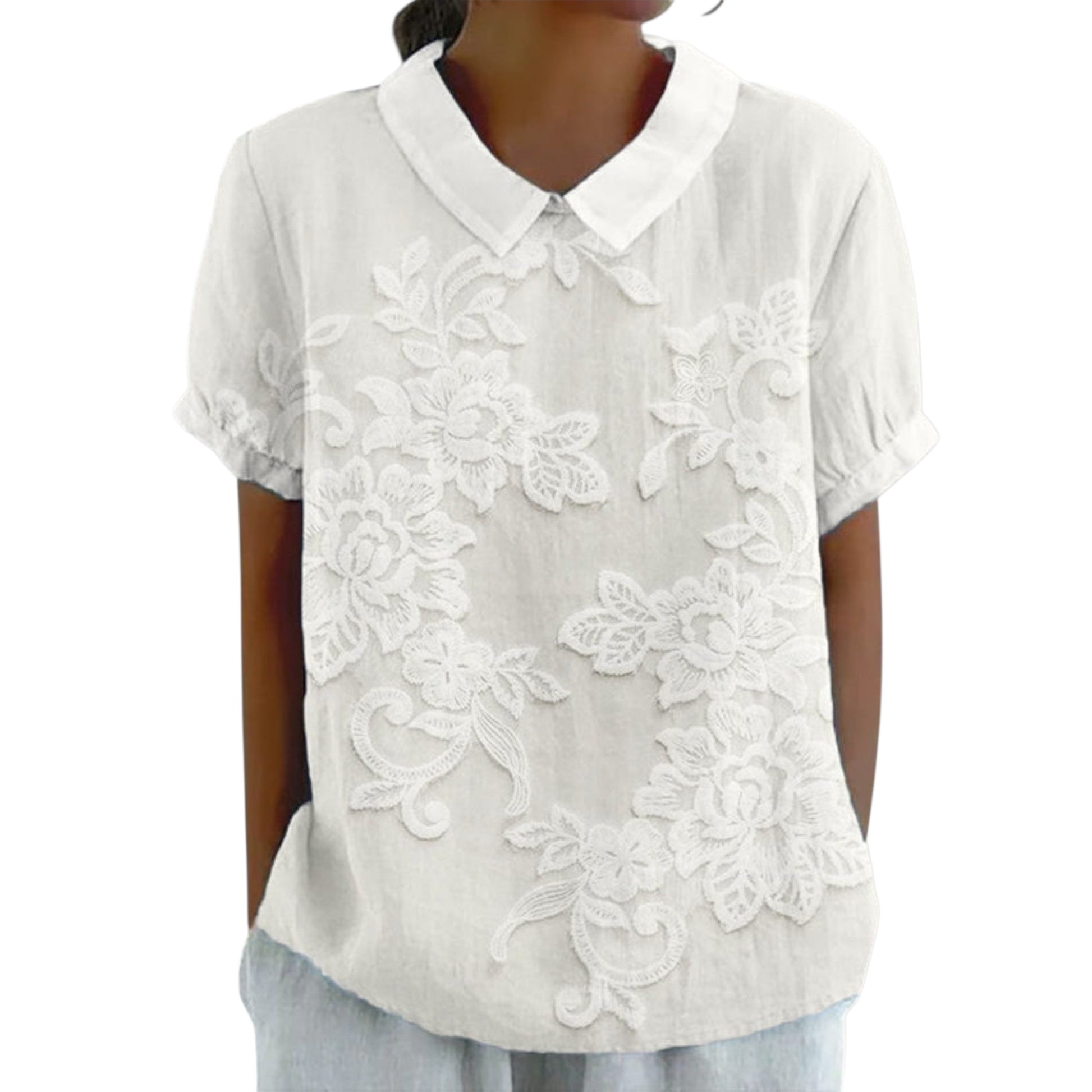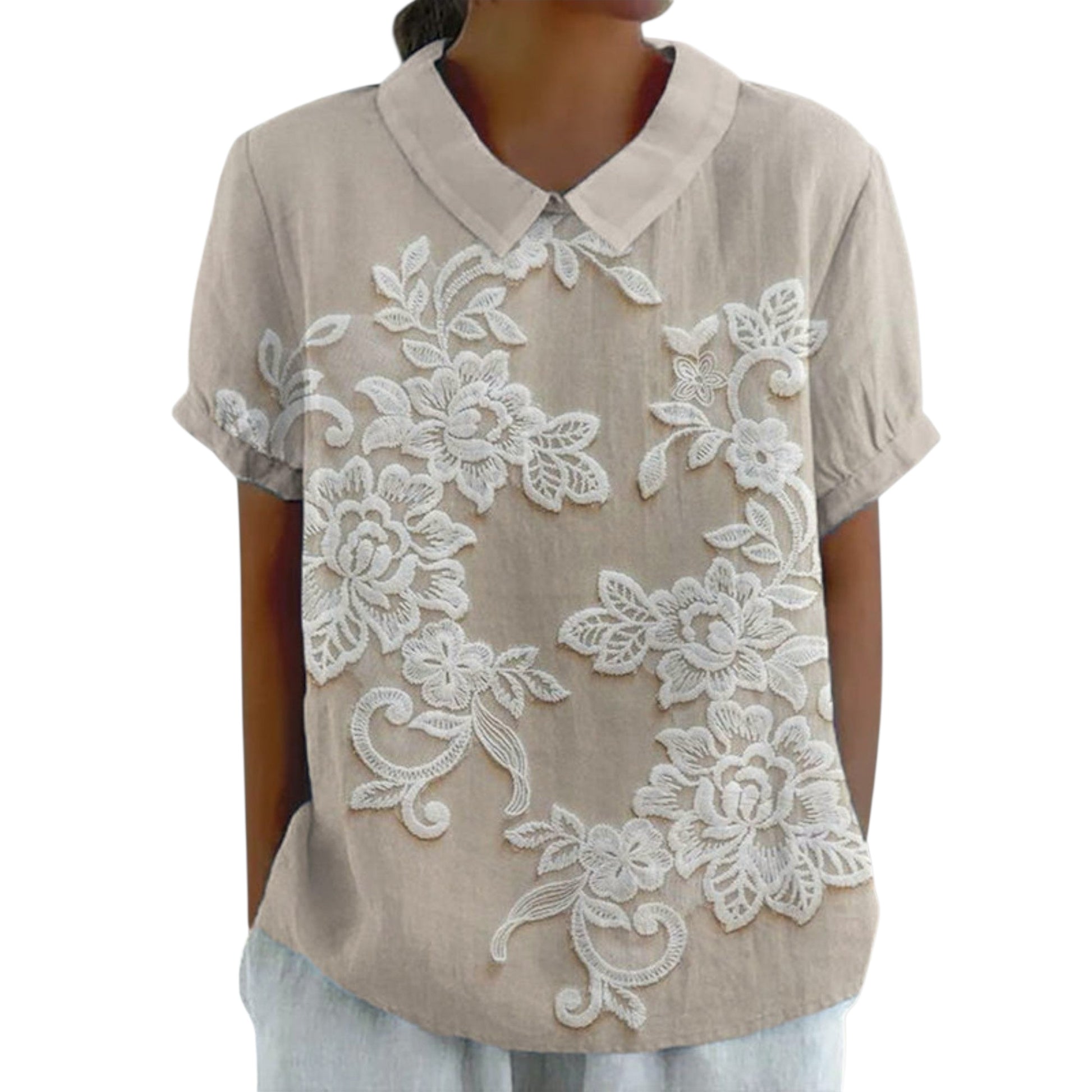 Valeska verbindet charmante Einfachheit mit romantischen Details. Die feine florale Stickerei und der klassische Peter-Pan-Kragen verleihen der Bluse eine feminine und zeitlose Ausstrahlung.