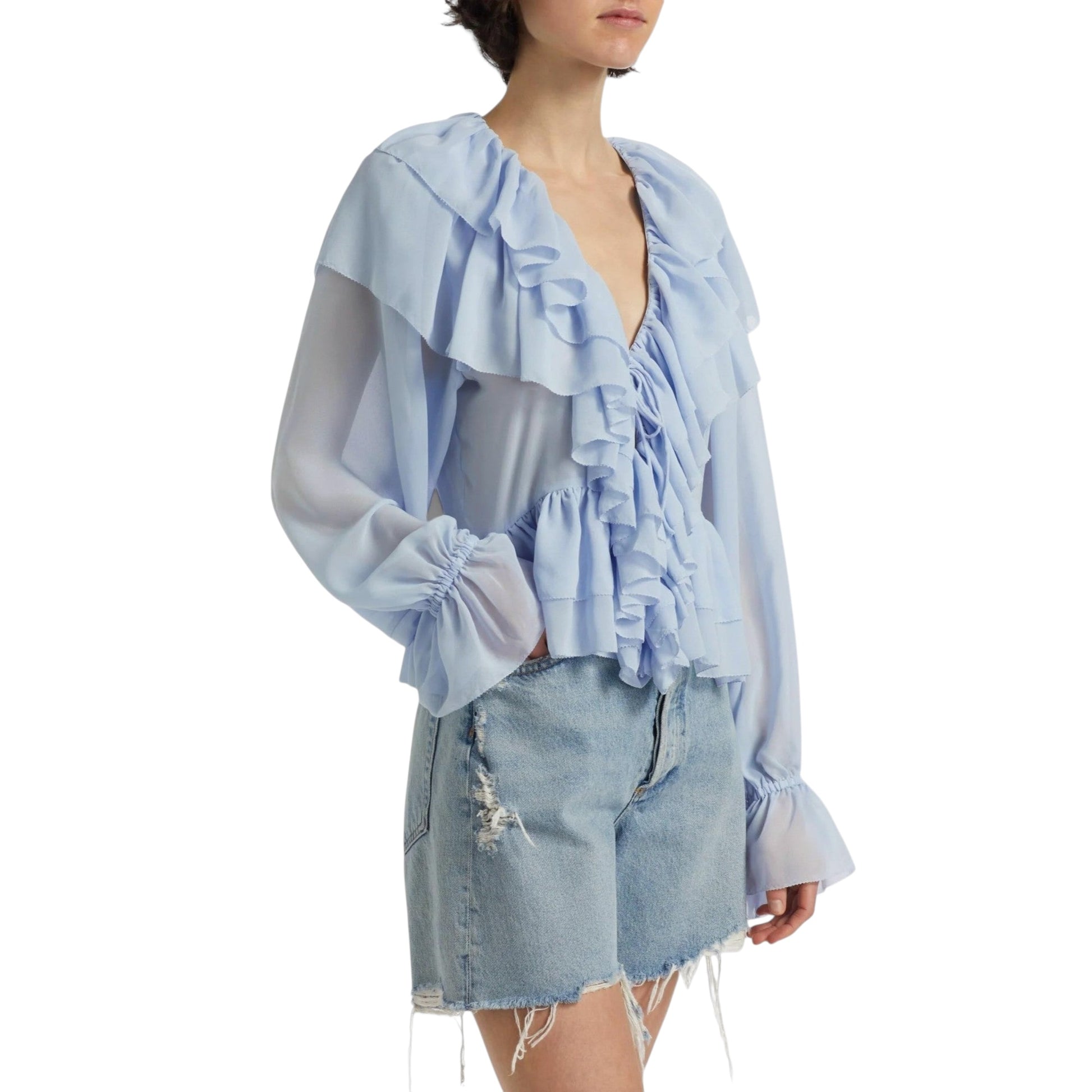 Celestina vereint romantische Leichtigkeit mit moderner Eleganz. Zarte, gestufte Rüschen verleihen der Bluse eine feminine Struktur, während der schmeichelnde V-Ausschnitt die Silhouette optisch verlängert.